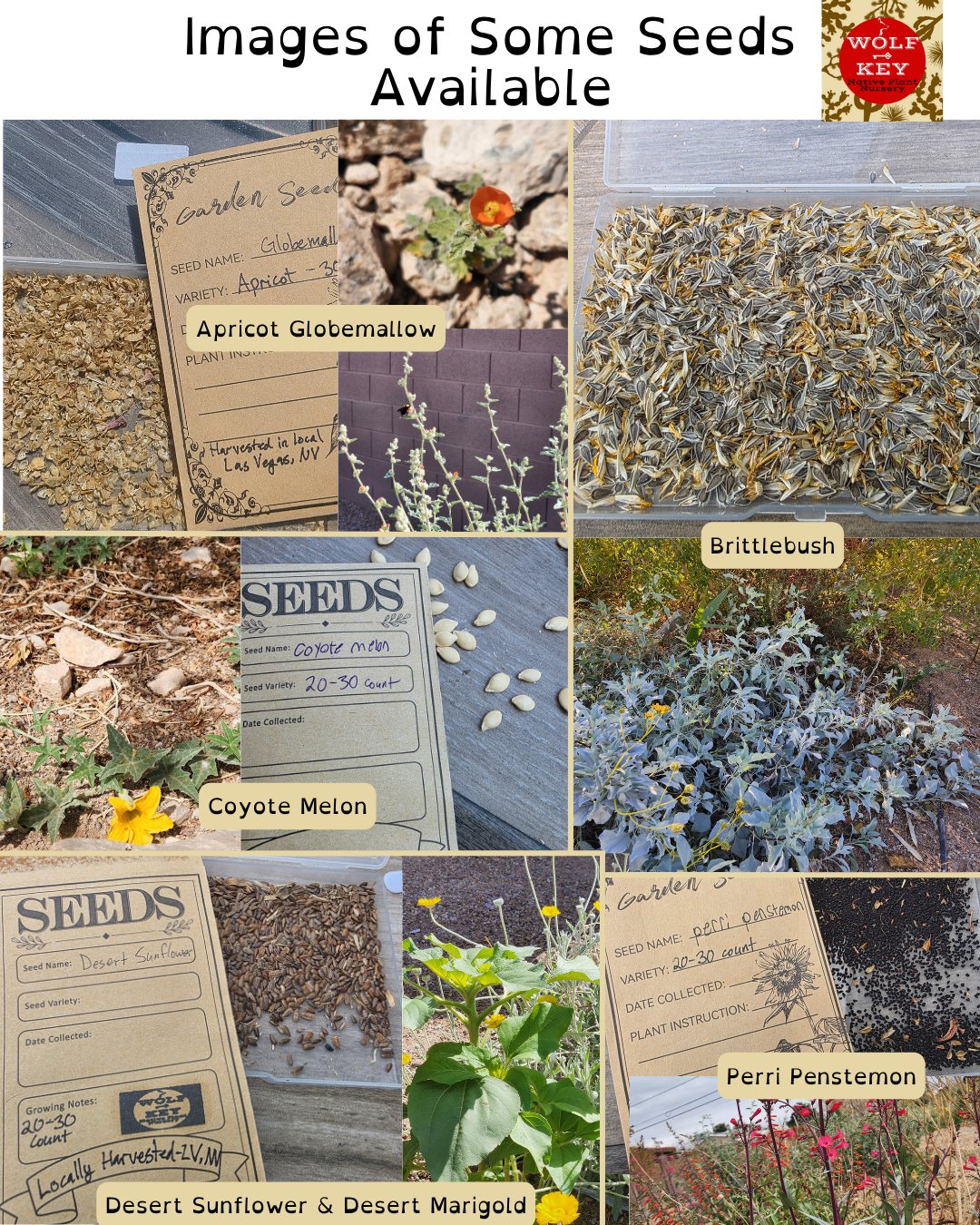 Includes a mixed selection of local Mojave and desert adapted species like creosote, desert milkweed, penstemons, globemallow, yucca, and more — all adapted to thrive in arid climates and support pollinators, coming in packs of 20-30 seeds per pack. With the exception of our Wildflower Mix pack which has up to 80 seeds.